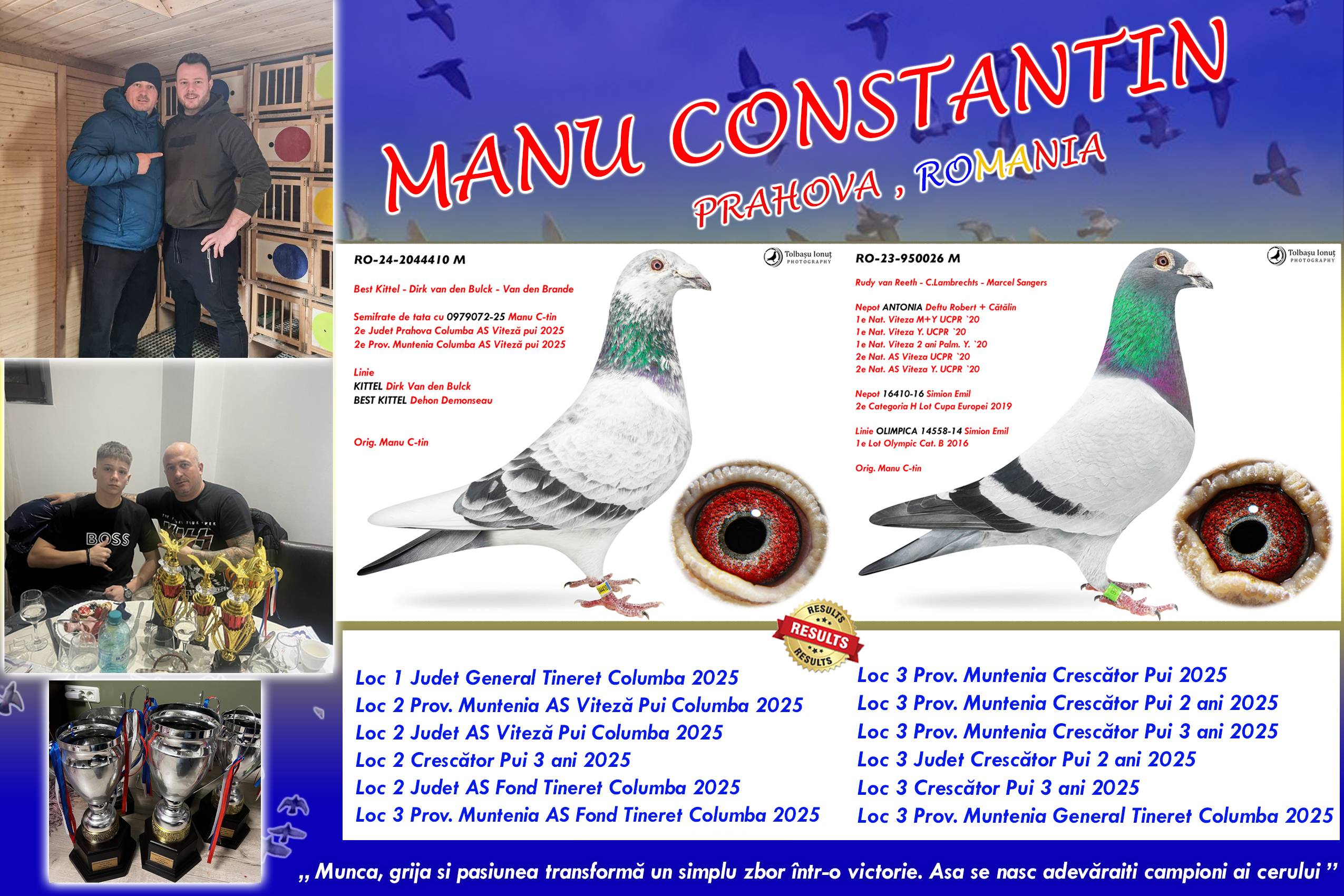 Manu Constantin din Prahova este un crescător dedicat și un investitor atent în tot ceea ce înseamnă performanță columbofilă. Pasionat și foarte motivat, el acordă o atenție deosebită fiecărui detaliu din pregătirea porumbeilor săi, fiind convins că antrenamentul, calitatea și forma porumbeilor fac diferența într-o cursă. Concurând an de an într-o concurenta foarte mare, Manu reușește să își mențină porumbeii la un nivel înalt și să obțină rezultate de top. Strategia lui este clară: la pui joacă întreg lotul, iar la maturi concurează doar cu femelele, sistem care i-a adus constanță și eficiență în rezultate.