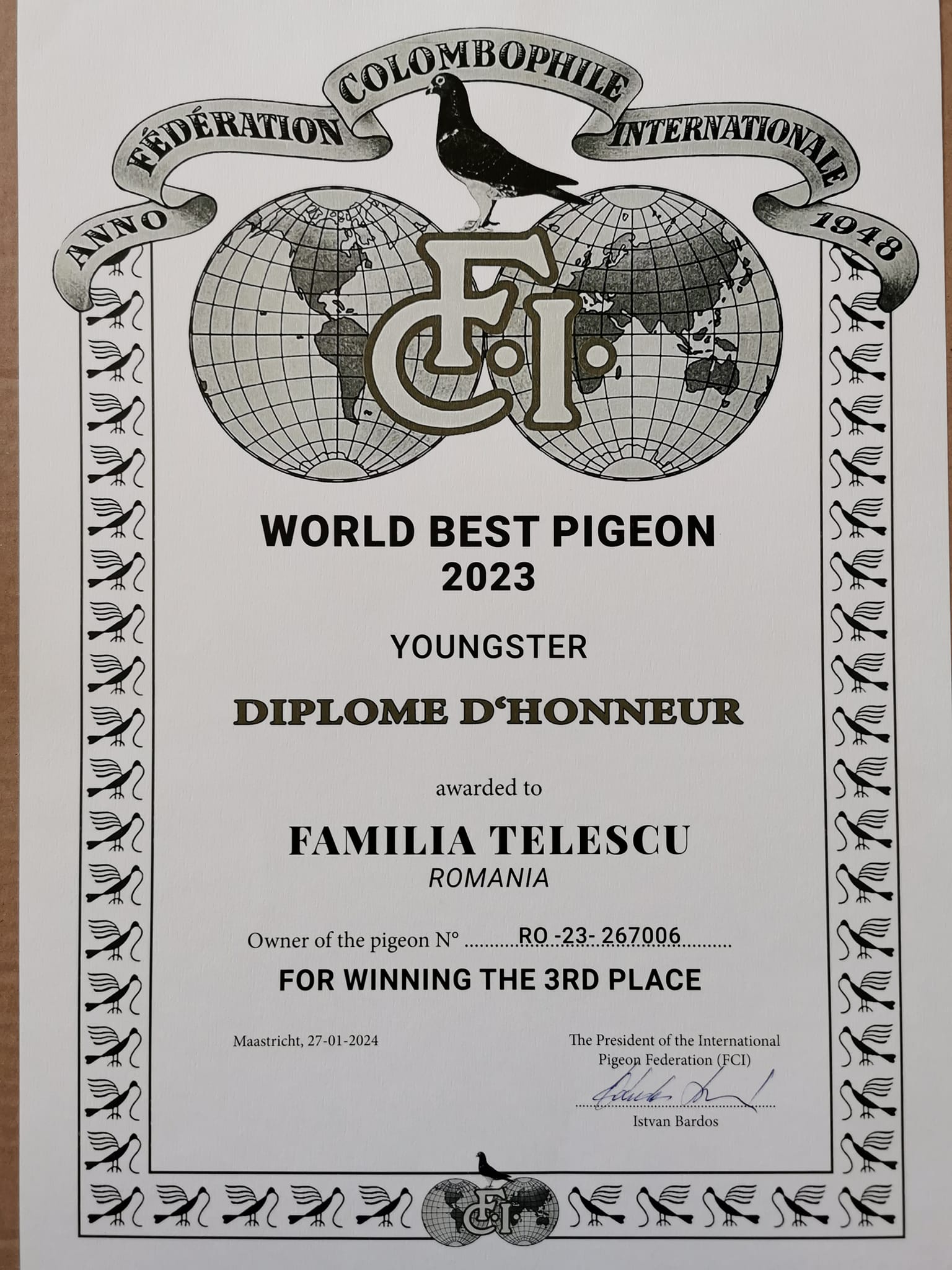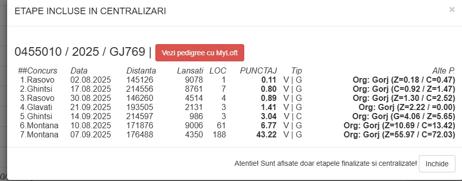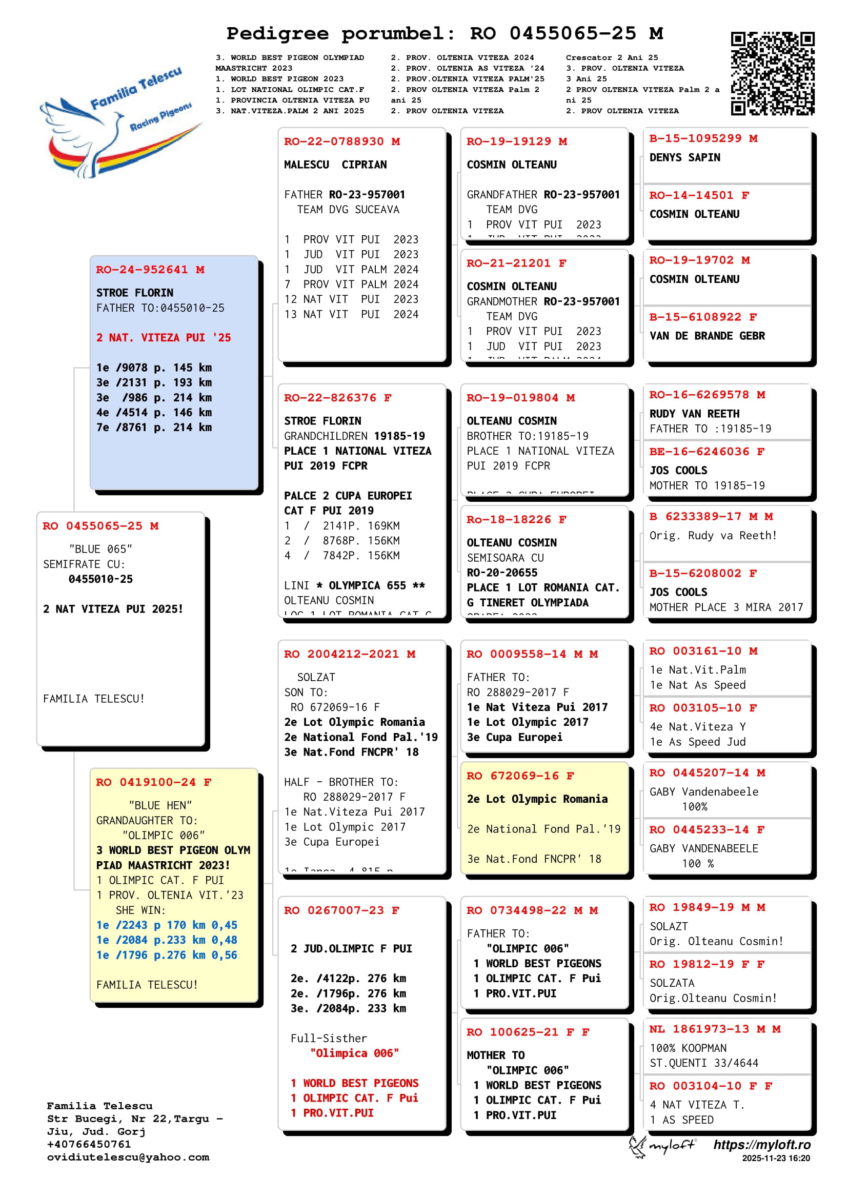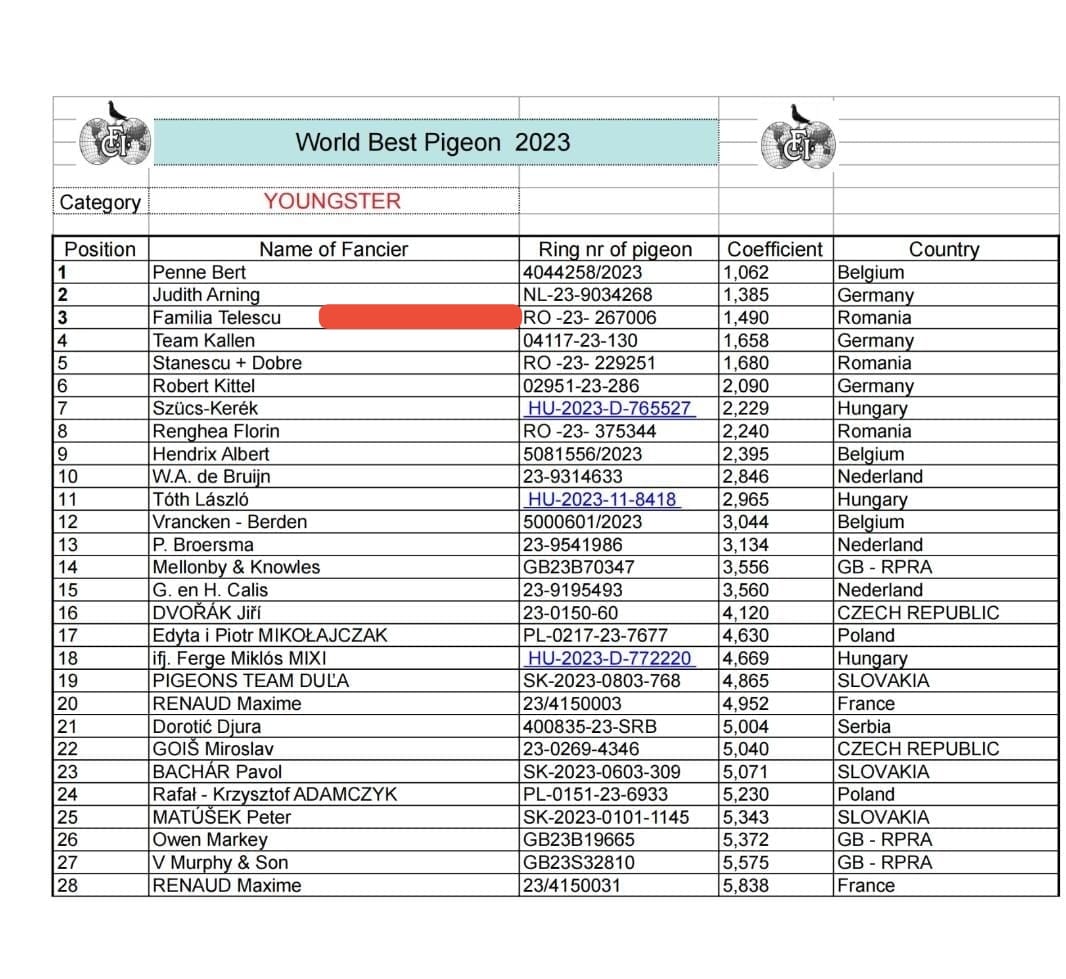 1.RO-25-455065 M ♂ Semifrate de tata cu 455010-25 Familia Telescu 2e Nat. Columba Viteză pui 2025 Nepot OLYMPICA 006 Familia Telescu
