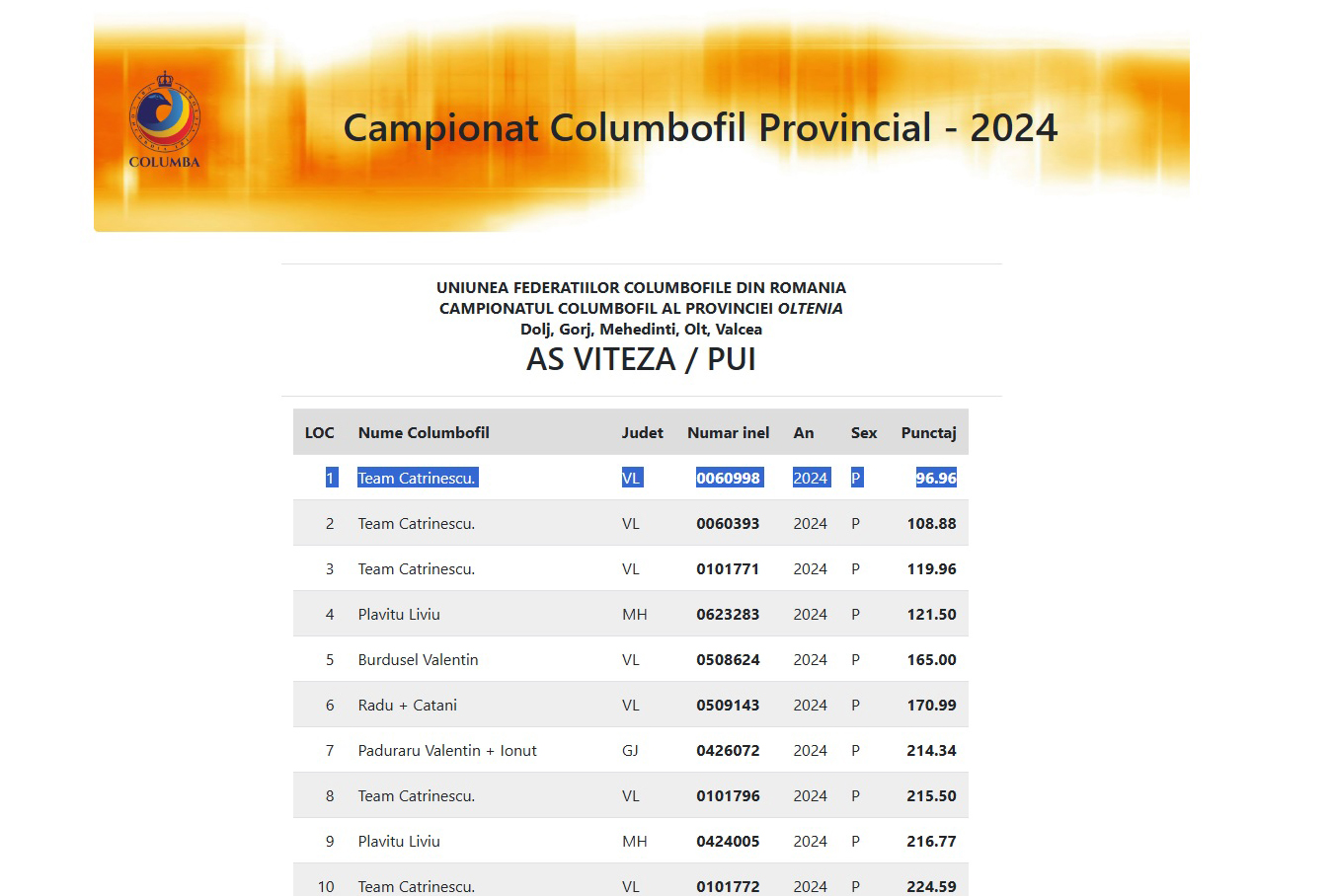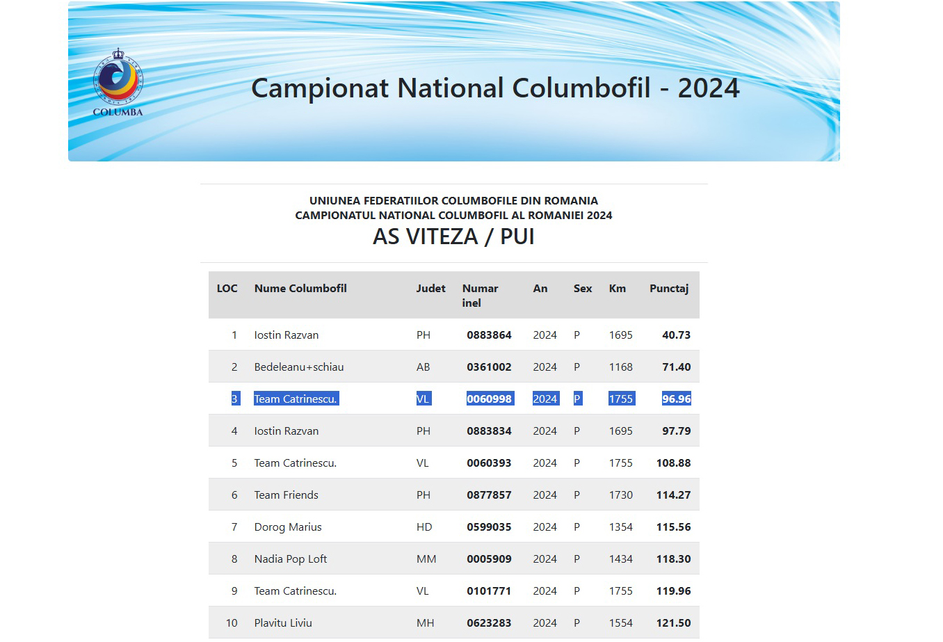 3.RO-24-101702 M ♂ Frate cu 0060998-24 Team Catrinescu 3e National Columba AS Viteză Pui 2024 1 / 143km 1295p. 1 / 280km 1084p.