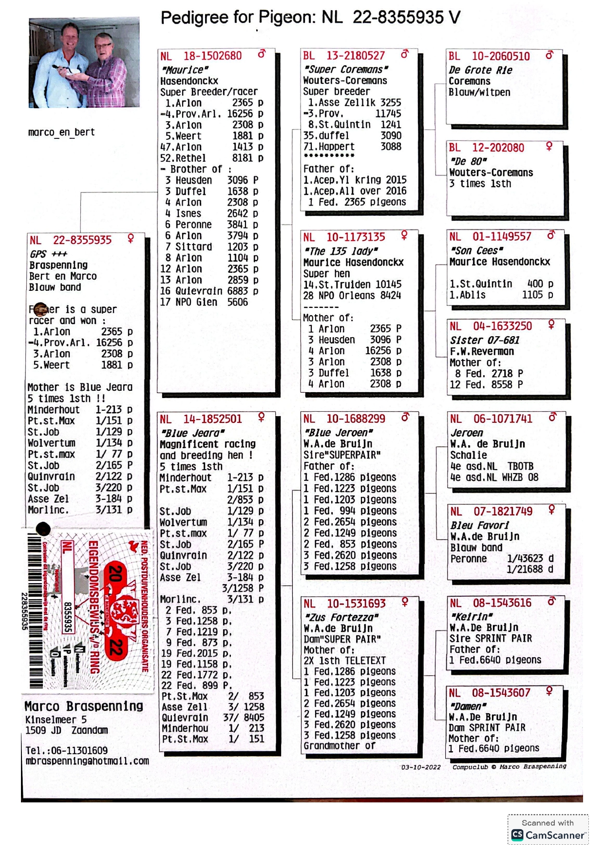 5.NL-22-8355935 M ♂ Fiu din 1852501-14 1e / 213p. 1e / 151p. 1e / 129p. 1e / 134p. Hasendonckx – W.A. de Bruijn