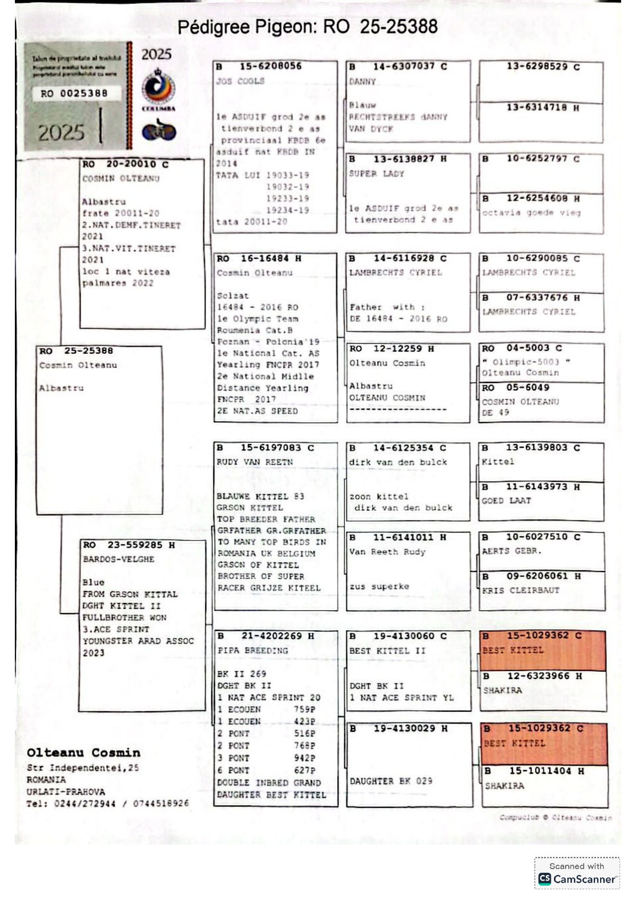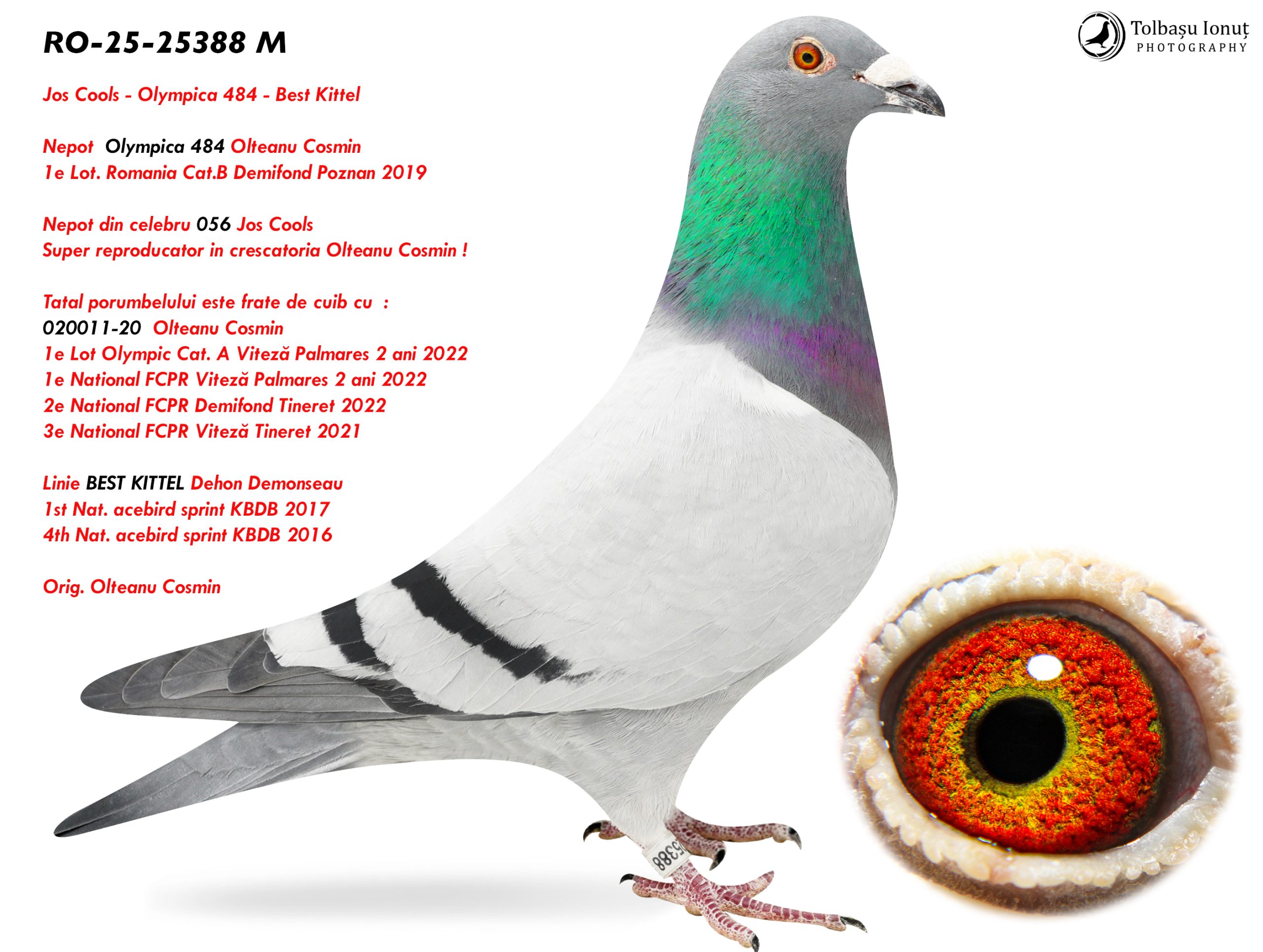 5.RO-25-25388 M ♂ Tatal porumbelului este frate de cuib cu : 020011-20 Olteanu Cosmin 1e Lot Olympic Cat. A Viteză Palmares 2 ani 2022