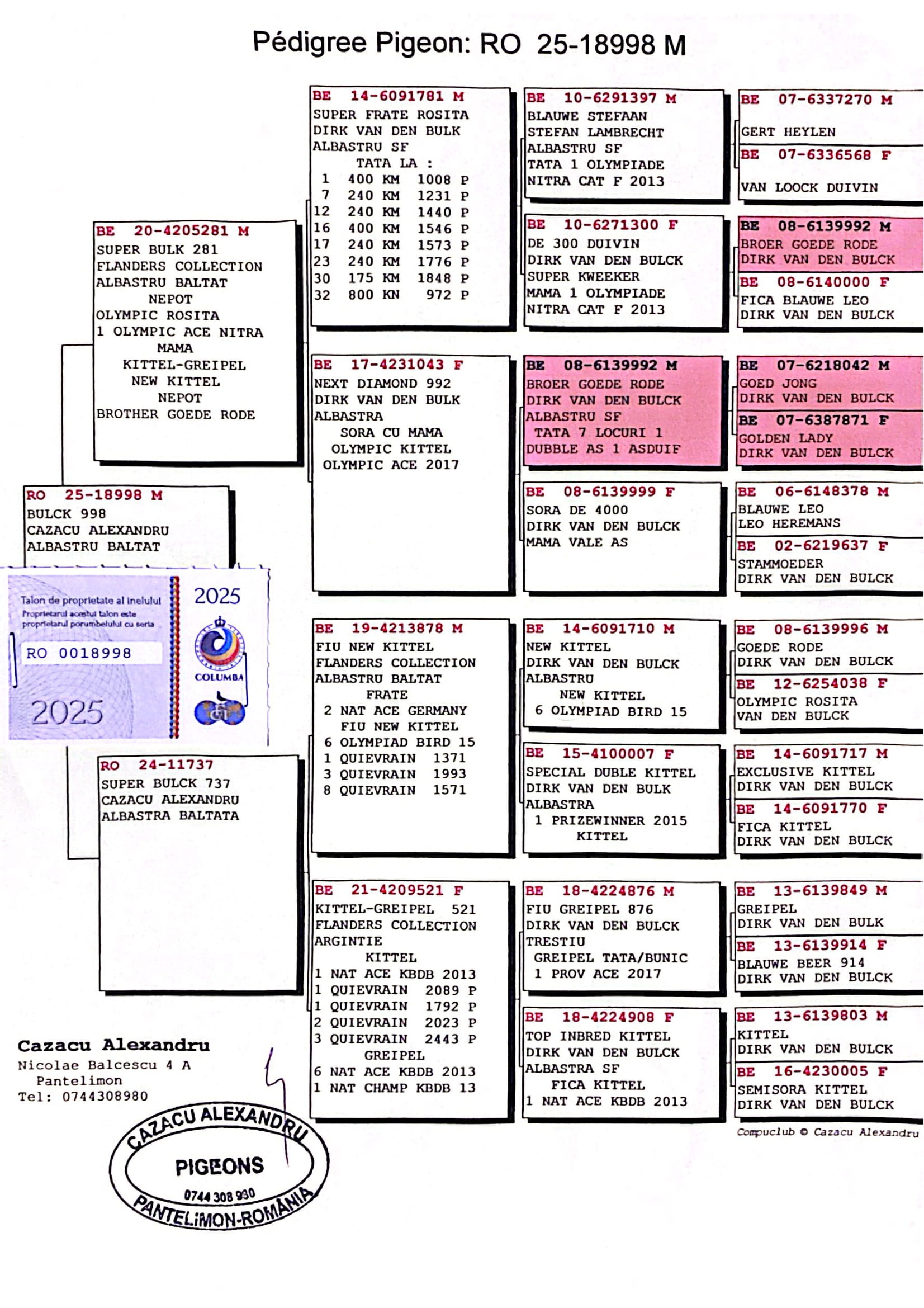 4.RO-25-18998 F ♀ Tatal porumbelului este nepot din Olympic Rosita Dirk van den Bulck 1. Olympiad acebird Nitra 2012
