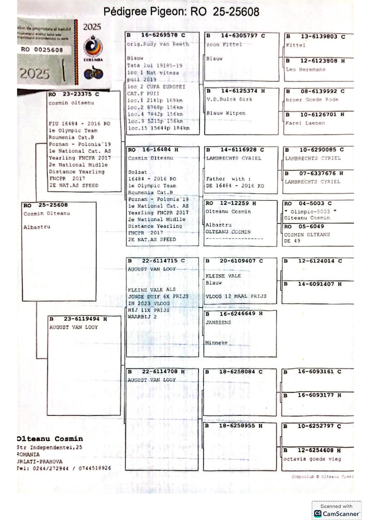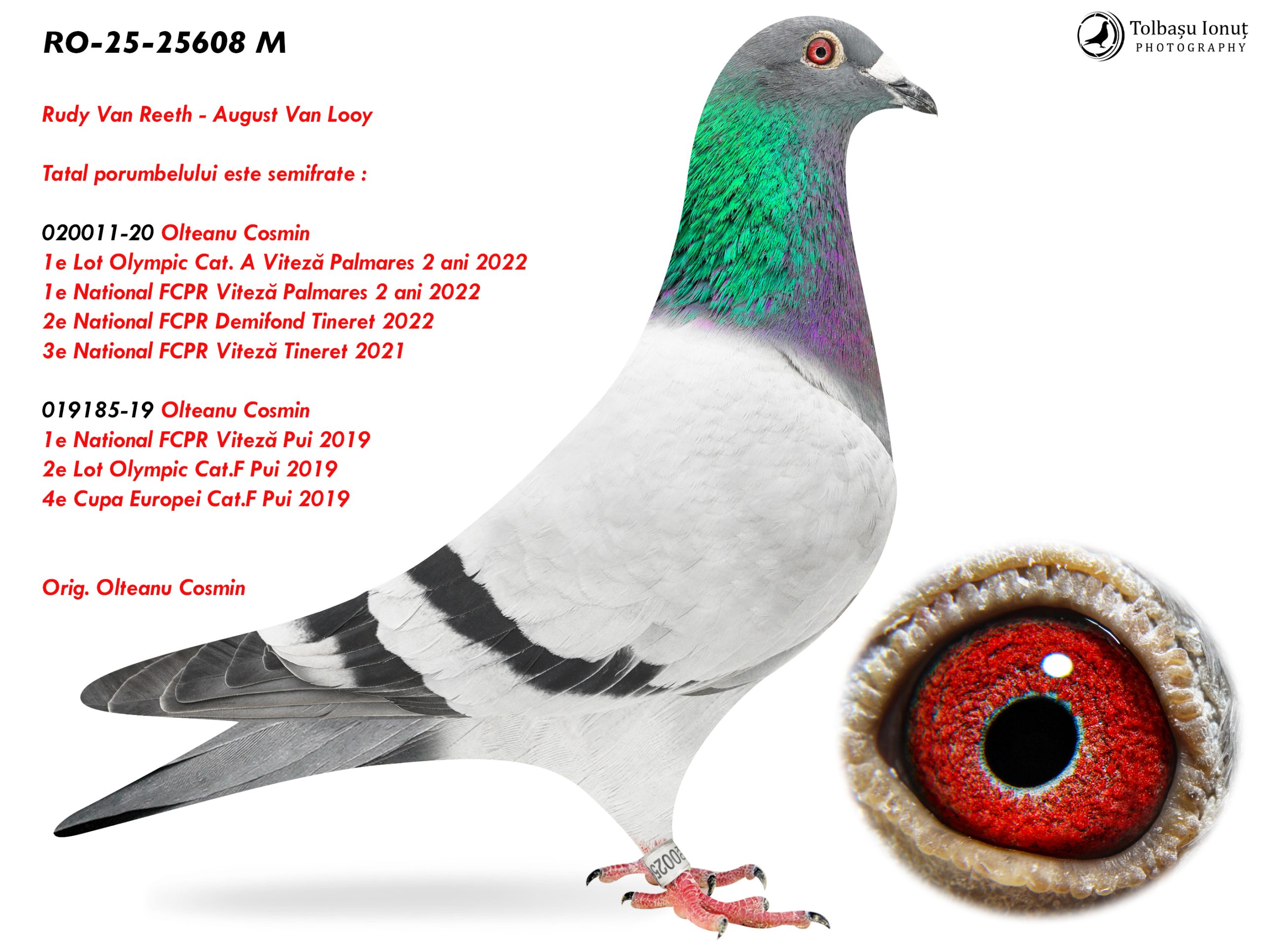 RO-25-25608 M ♂ Tatal porumbelului este semifrate : 019185-19 Olteanu Cosmin 1e National FCPR Viteză Pui 2019 2e Lot Olympic