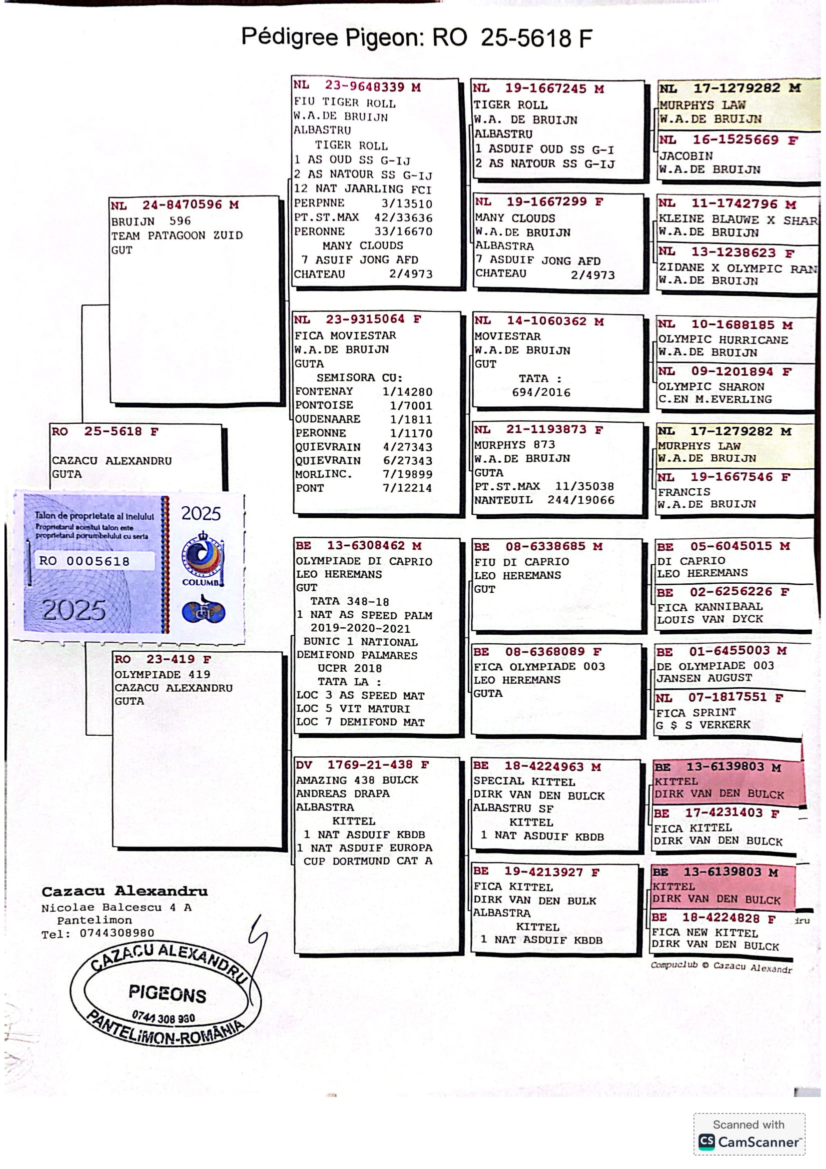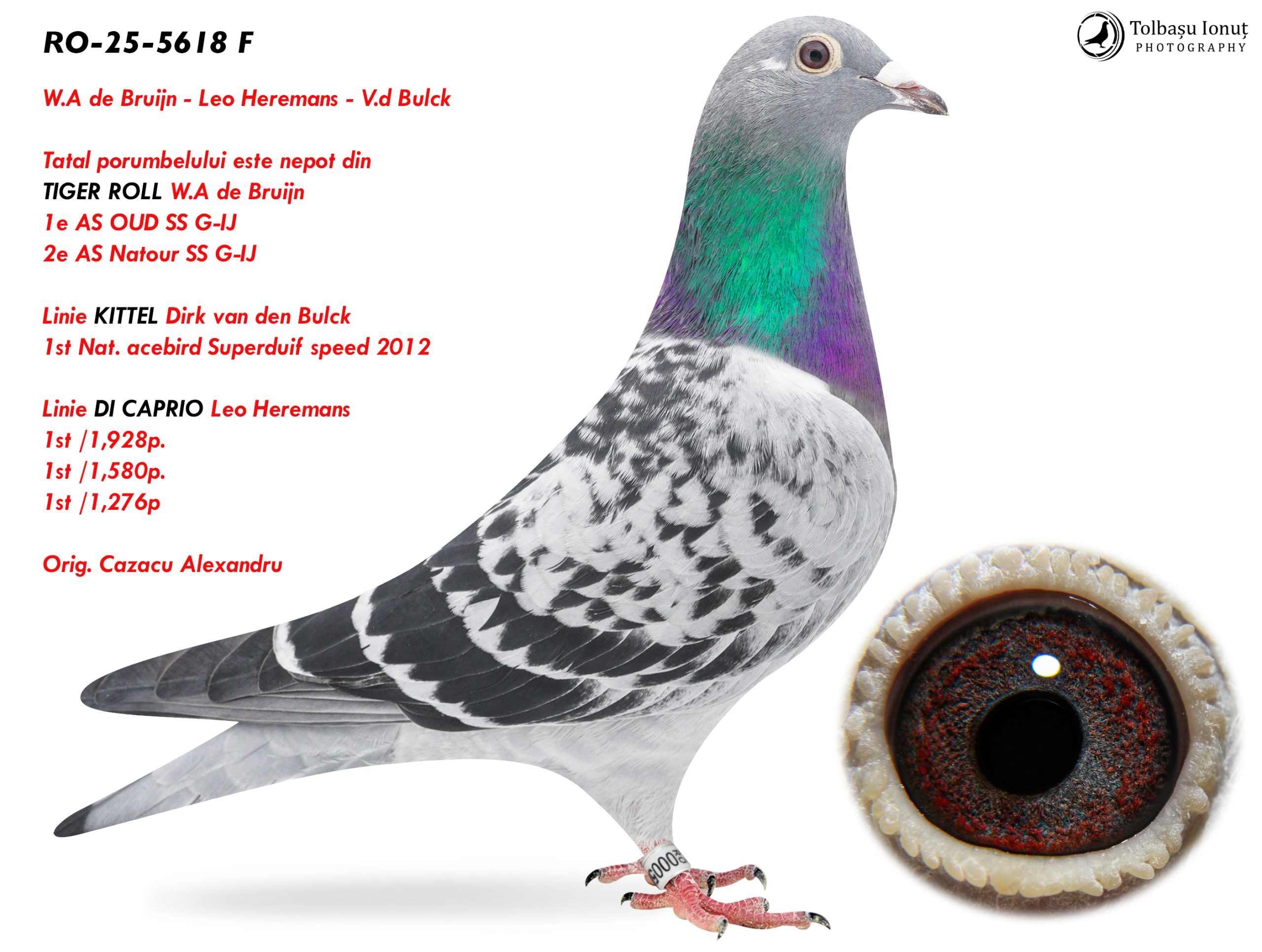 RO-25-5618 F ♀ Tatal porumbelului este nepot din TIGER ROLL W.A de Bruijn 1e AS OUD SS G-IJ 2e AS Natour SS G-IJ Linie KITTEL